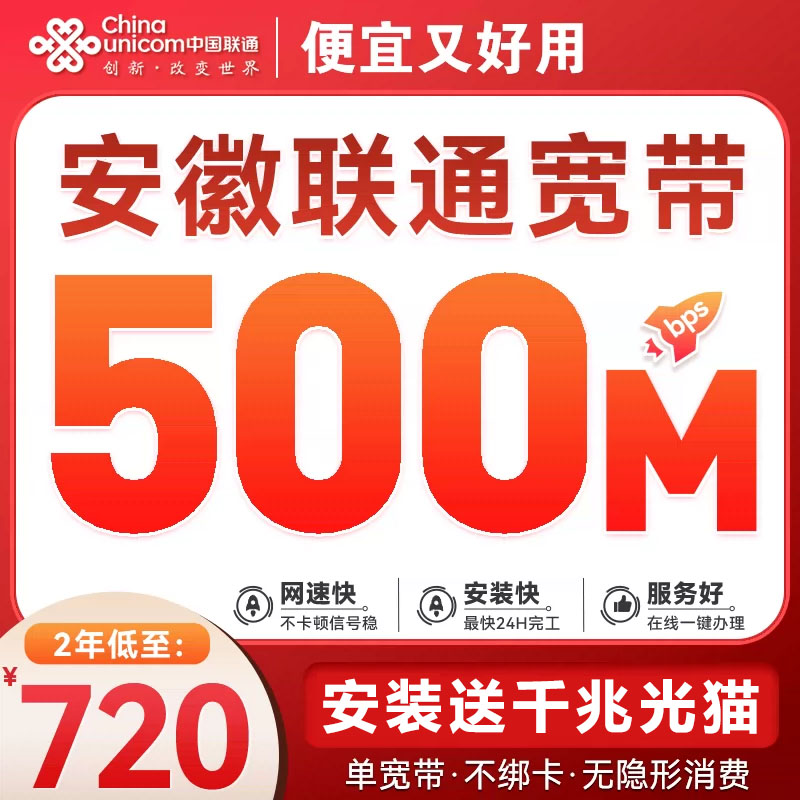 安徽联通单宽带500M720元包2年